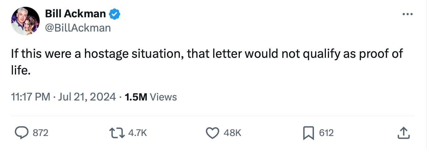 Billionaire hedge fund boss Bill Ackerman claimed that the signature on Biden's letter of resignation was forged. On Sunday, Ackerman posted on X: "If this were a hostage situation, that letter would not qualify as proof of life."