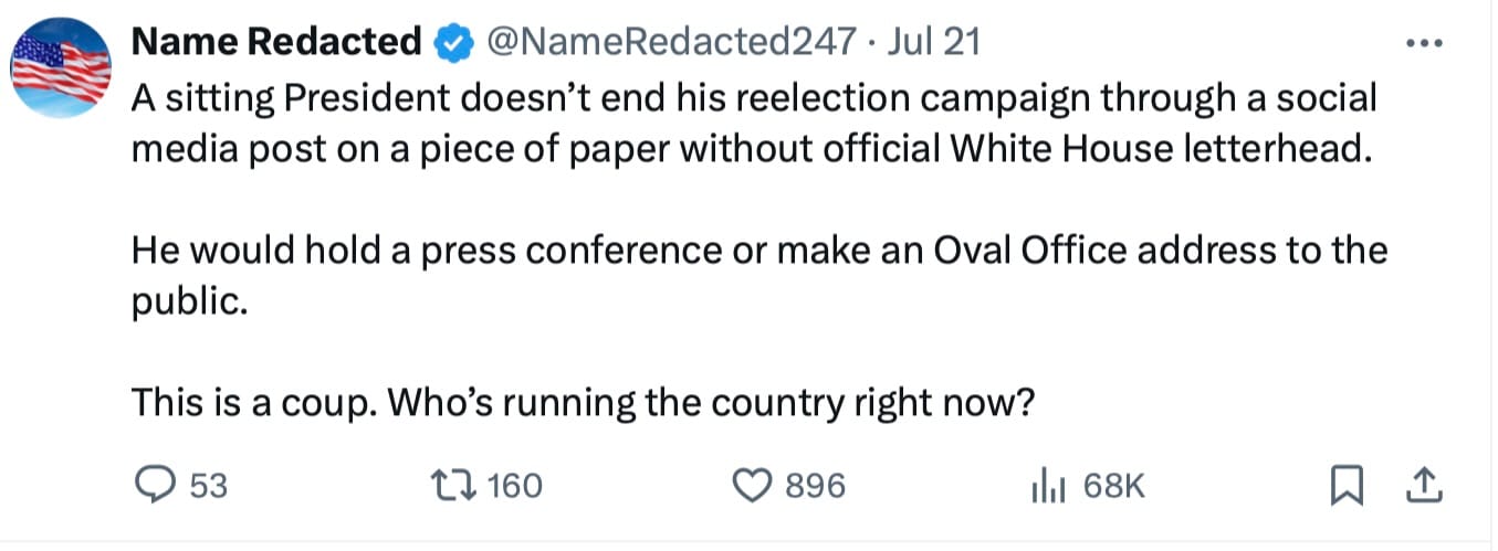 A sitting President doesn’t end his reelection campaign through a social media post on a piece of paper without official White House letterhead.